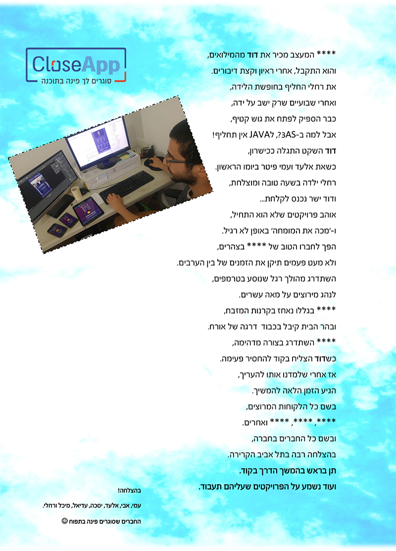 ודוד ממשיך הלאה. שיהיה הרבה בהצלחה. (הברכות שכתבנו לו בתמונה).