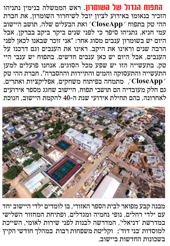 ראש הממשלה בנימין נתניהו הזכיר בנאומו באירוע לציון יובל לשיחרור השומרון, את חברת ההי טק בתפוח 'CloseApp' ואת הבעלים שלה, תושב היישוב עמי חניא.