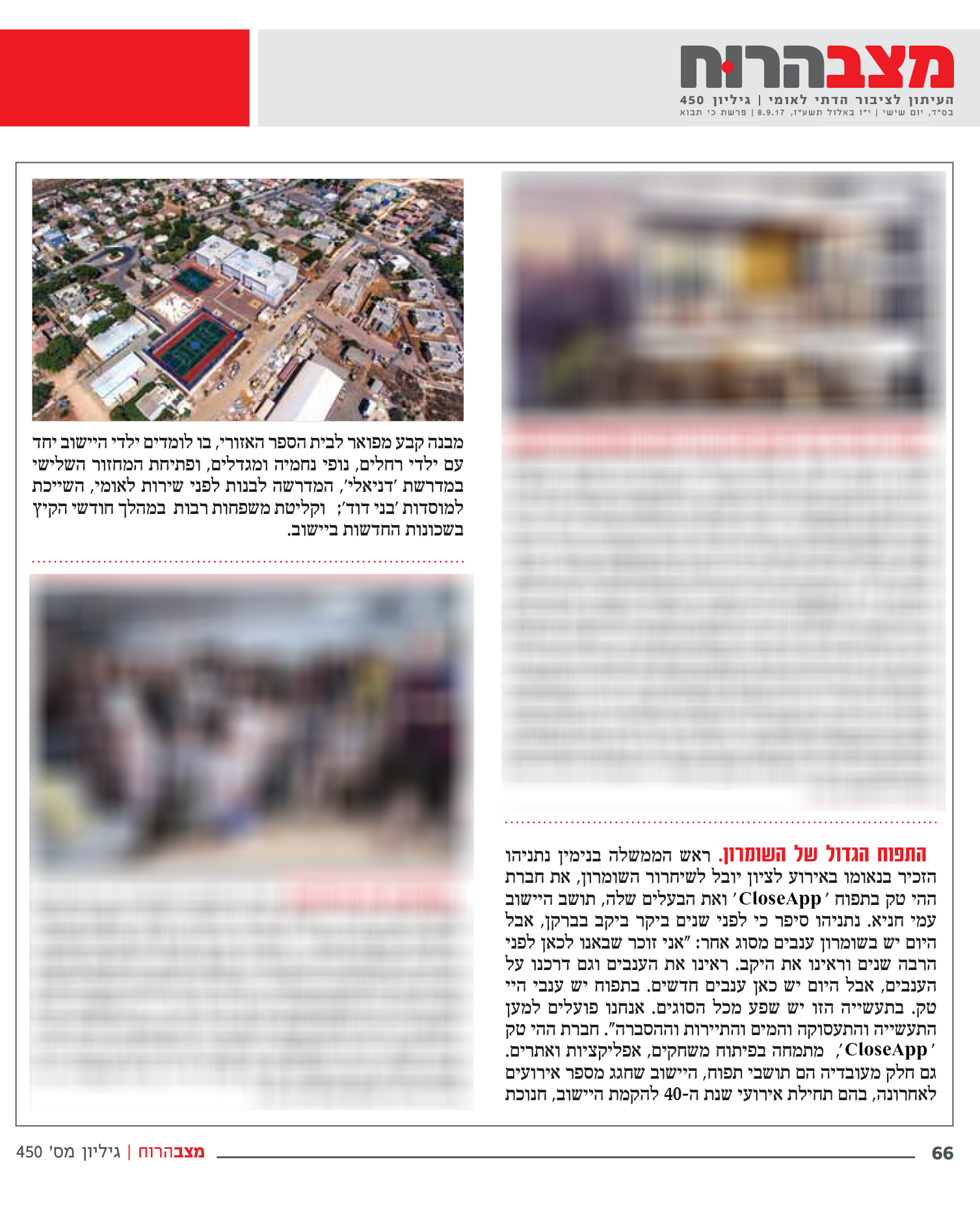 השבת התפרסמה ידיעה על חברת CloseApp בעלון השבת "מצב הרוח" בעקבות נאום של ראש הממשלה שבו הזכיר את העשייה של החברה בכפר תפוח ובשומרון.
