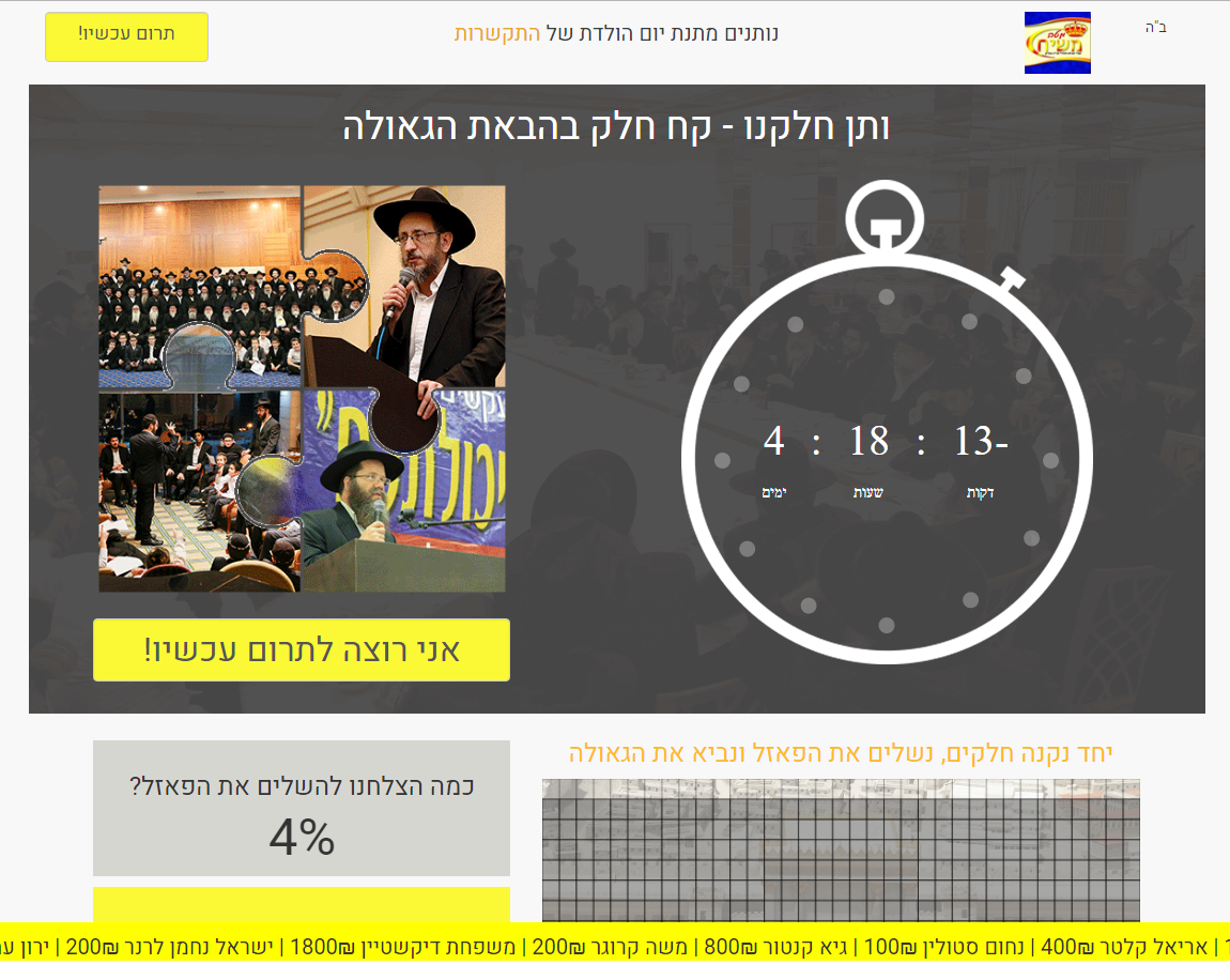 לפני כמה חודשים פנו אלינו ממטה משיח של חב"ד על מנת שנבנה עבורם עמוד לגיוס כספים, בדומה לאתרי גיוס המונים אחרים. האתגר הפעם היה זמן מהיר לפיתוח והקפדה על איכות ומהירות.