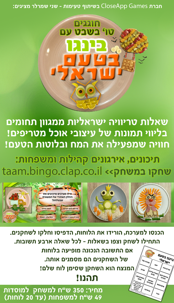 שמחים להציג משחק נוסף של בינגו אינטראקטיבי מבית CloseApp והפעם בינגו בטעם ישראלי בשיתוף עם טעימות – שני שמרלר:
