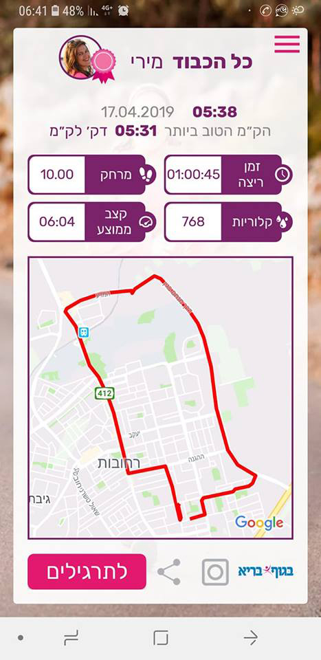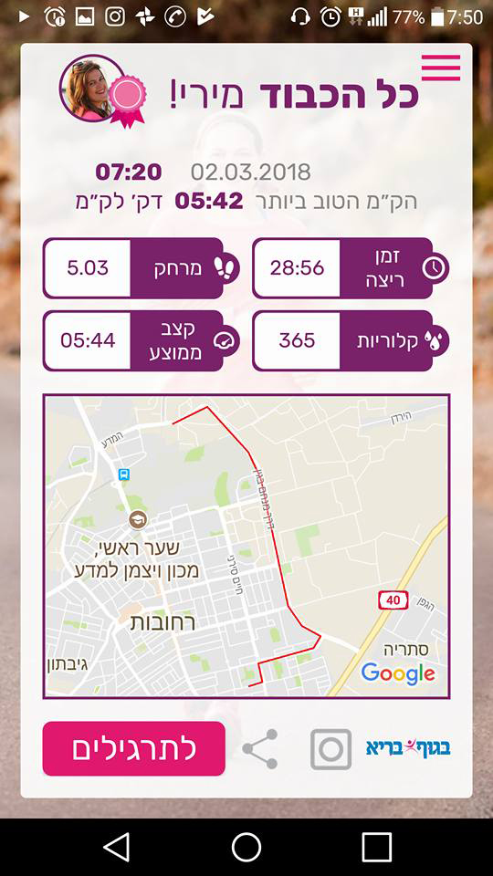 והתוצאה לאחר חודשים של עבודה ובדיקות והרבה ריצות וזיעה של מירי בבדיקות האפליקציה היא אפליקצית ריצה מדהימה שעושה חשק לצאת מהבית ולרוץ.