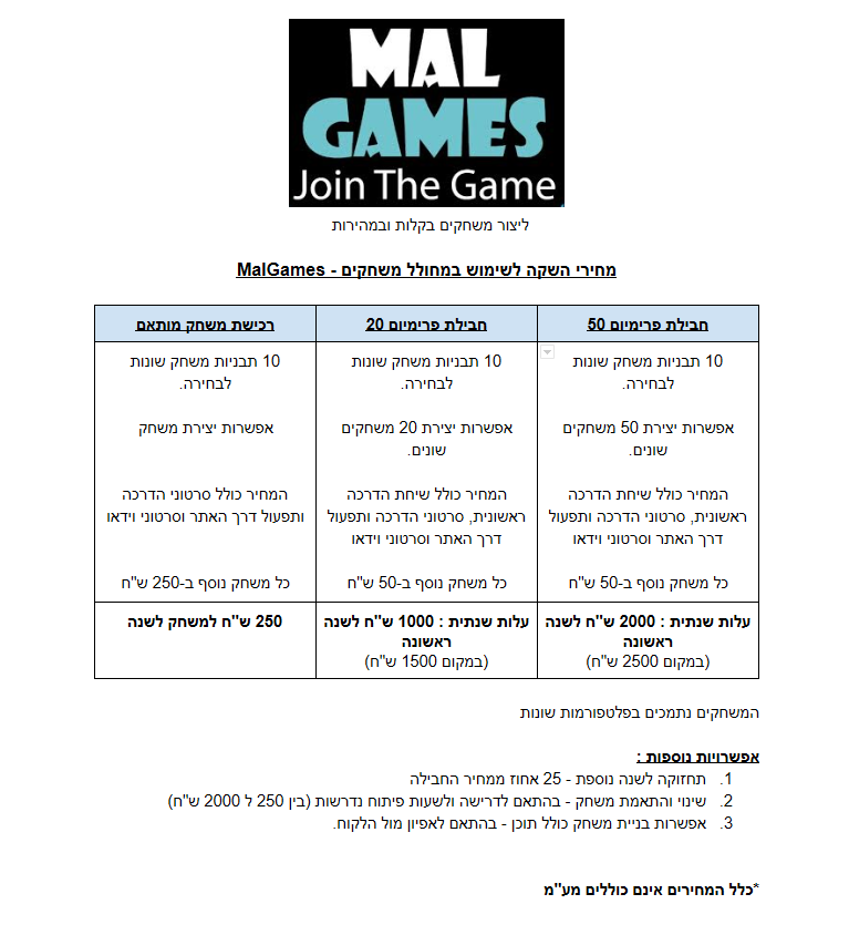 מחירי השקה – מחירון מחולל המשחקים