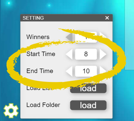 • קביעת משך ההגרלה – מערכת ההגרלות מגרילה בנוסף להצגת השמות באופן רנדומלי גם במשך זמן רנדומלי, וכעת בלחיצה על הכפתור ההגדרות ניתן לקבוע את טווח הזמנים ואורך ההגרלה לדוגמה בין שניה לחמש שניות. וכך ליצור הגרלות מהירות או אטיות יותר.