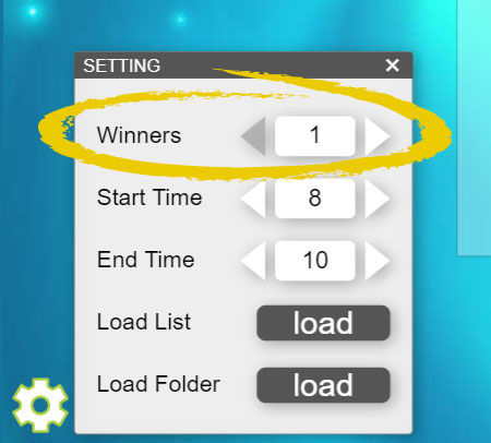 • קביעת מספר הזוכים בכל סבב של הגרלה – בבחירת בכפתור ההגדרות ניתן לבחור את מספר הזוכים שיהיו בהגרלה אותה מציגים, ניתן לבחור כל מספר שרוצים והכלי יאסוף את המוגרלים ויציג אותם בעיגול במסך התוצאות.
