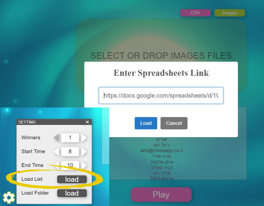• טעינת רשימת שמות מגוגל דרייב – רוצים לטעון תמיד את אותם שמות או להשתמש במאגר שמות קבוע? לחצו על הגדרות ובחרו בטעינת קובץ גוגל שיטס, הדביקו את הקישור של הטבלה שלכם (יש לוודא שהיא מוגדרת ציבורית ושיש בה עמודה עם השמות NAMES) וכעת בכל פעם שתכנסו על הקישור שנוצר מערכת ההגרלות תטען את ההגרלה שהכנתם.