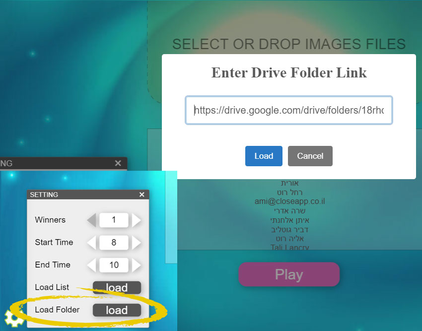 • טעינת תמונות מגוגל דרייב – מעלים תמונות לגוגל דרייב, מגדירים את התיקייה כתיקייה ציבורית, בוחרים בכפתור ההגדרות לטעון תמונות מגוגל דרייב, ויש לכם הגרלה מוכנה ושמורה של תמונות מהדרייב שלכם!