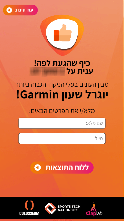 בין העונים נכונה נערכה תחרות והזוכים יכלו לזכות בשעון ספורט יוקרתי מסוג GARMIN. לאחר מענה על השאלות הופיע הציון הסופי, לאחר הזנת פרטים להשתתפות, הופיעה טבלת המובילים במשחק.